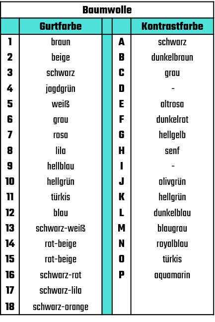 In diesen Tabellen sind die Grundpreise für Gurte mit einer Schnurfarbe und Basis-Webung (also Brustbeinsteg und stabilisierende Seitenwebung) zu sehen.